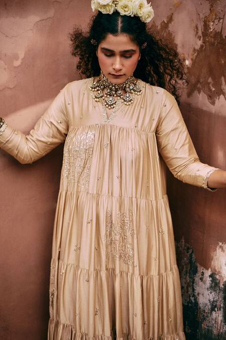 Beige tiered anarkali featuring aari, zardozi, cutdana, and sequin embroidery in a floral pattern