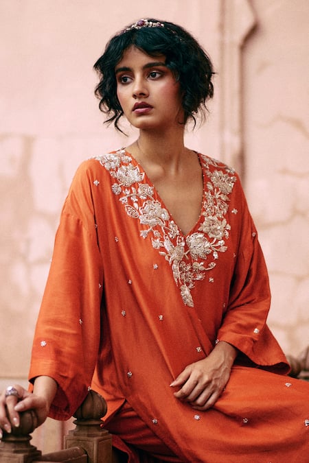 Orange Modal, Satin, Organza Embroidery Plunge Neck Zardozi Kaftan Kurta Set