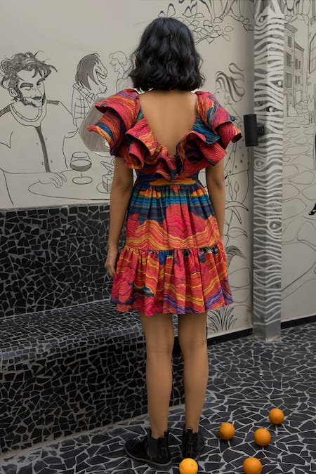 Multicolor dress with abstract print and ruffle detail on the neckline.