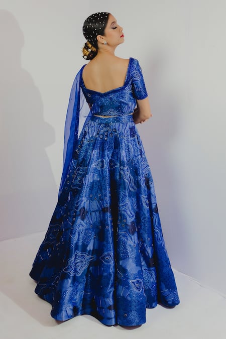 Electric blue lehenga with abstract print & cutdana, sequin embroidery. Paired with blouse & dupatta.