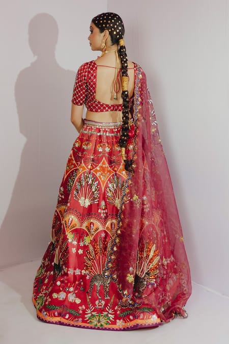 Red Organza, Imported Satin Floral, Metallic, Cheetah V Print Bridal Lehenga Set