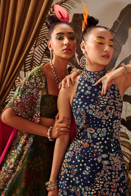 Green cape with all-over embroidery and abstract print. Comes with printed bustier and skirt.