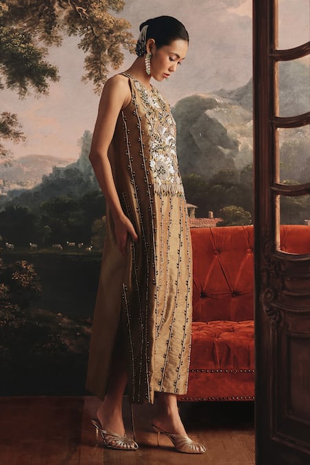 Gold tissue dress with intricate embroidery featuring metallic coins, floral patti motifs and delicate green crystal accents for refined shimmer. Subtle side cuts complement the rich textured fabric and detailed work.