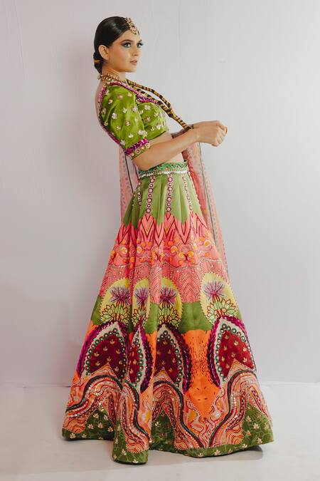 Neon orange & pickle green lehenga with floral, bead embroidery. Paired with blouse & dupatta.