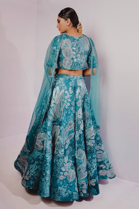 Turquoise teal blue lehenga with floral print & bead embroidery. Paired with blouse & dupatta.