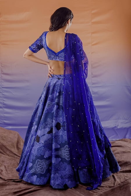 Blue Thick Satin Cloud V Neck Print Lehenga Set