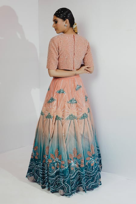 Peach to turquoise ombre shaded lehenga with sequin, floral embroidery. Paired with blouse.