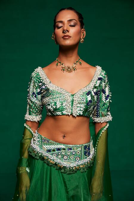 Green lehenga featuring an attached cancan and embellished waistband. Paired with a padded blouse with a back deep U neck and a semi-sheer dupatta with embellished borders.