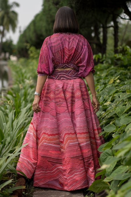 Pink Georgette, Imported Satin Sequin, Bead, Wave V Neck Print Skirt And Top Set
