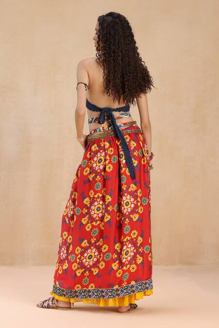 Red Linen Slub Print Boho Fleur Wajiha Skirt