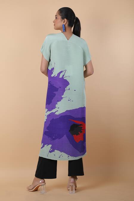 Placement abstract pattern in vibrant colors, Pleated texture design, V-neckline for a modern touch