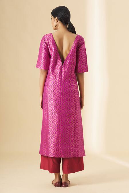 Pink straight long kurta with all-over gold tone floral woven motifs & deep V-back.