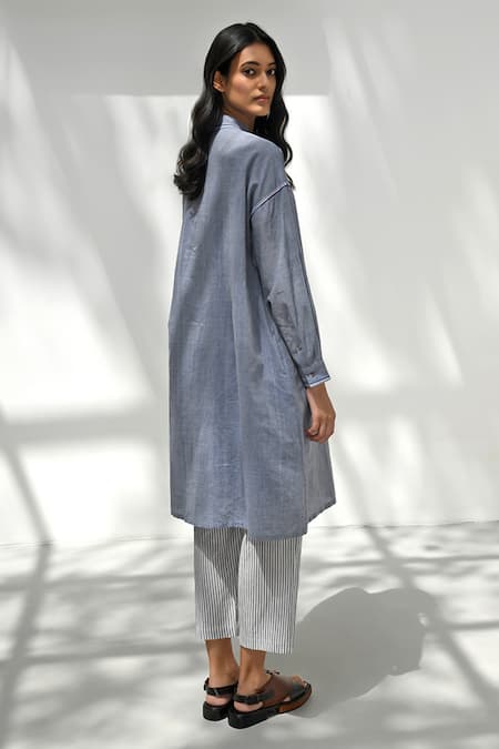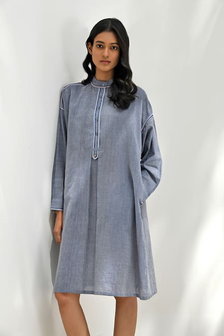 Blue chambray cotton dress featuring reverse box pleated detailing and contrasting thread hand embroidery on seams