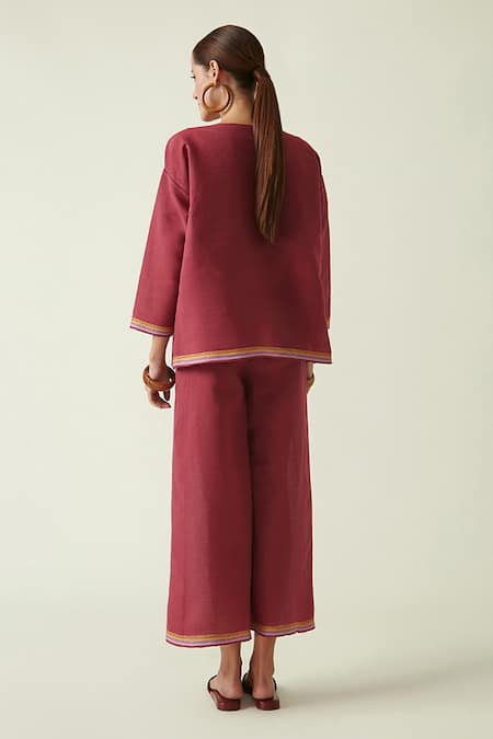Burgundy palazzo with contrast trim at the hems and side pockets.