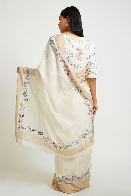 Ecru saree with all-over jaal embroidery and delicate zari border.