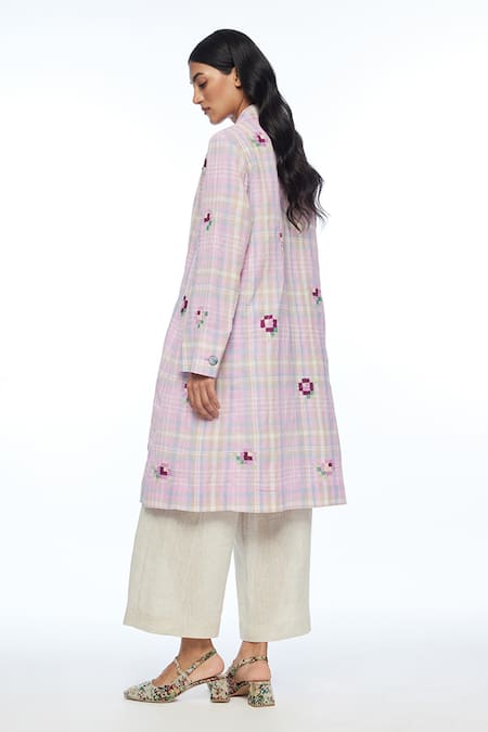 Purple Linen, Cotton Embroidery Notched Neck Checkered Designer Jacket