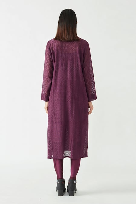 Aubergine wrap style kurta with all-over embroidery and bead embellishment. Comes with inner and dhoti pants.