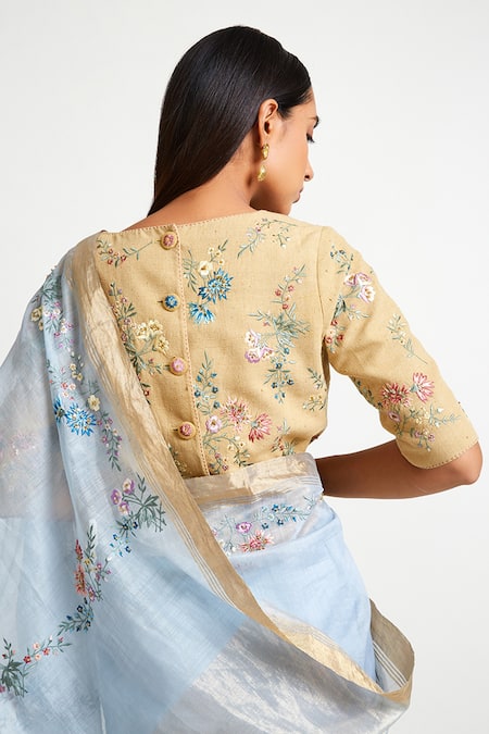 Gold blouse highlighted with floral embroidery, round neckline and button placket at the back.