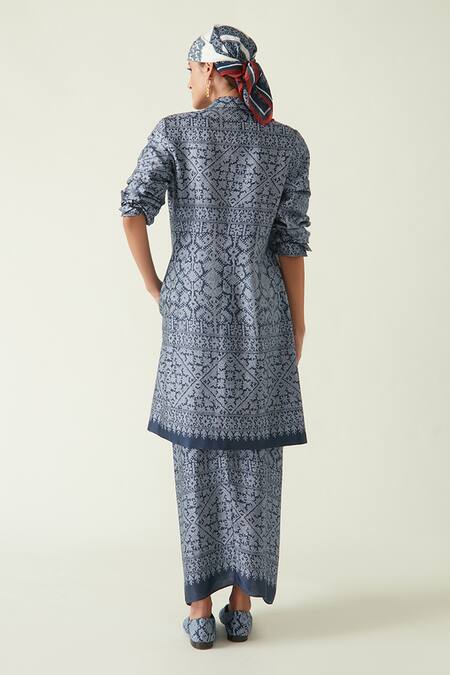 Blue Modal Satin Printed Batik Notched Lapel Collar Guinea Jacket