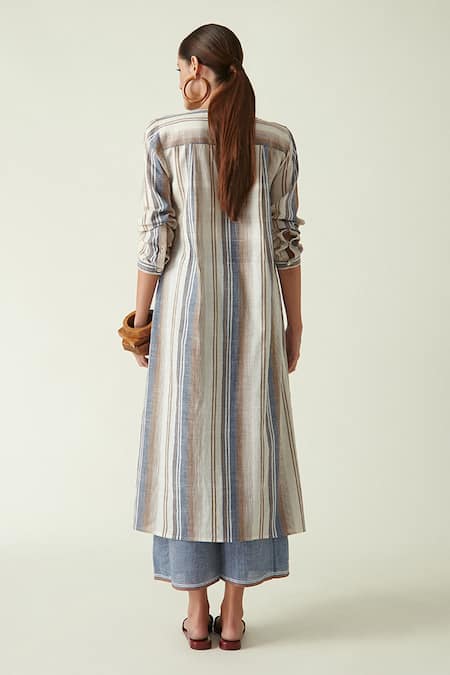Brown, blue cotton handloom tunic with stripes and pintuck detail in front.