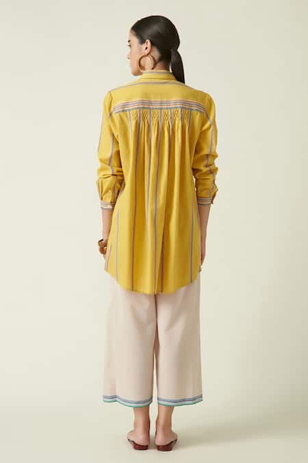 Yellow tunic with dobby woven stripes, hand stitched beads and smocking at the back.