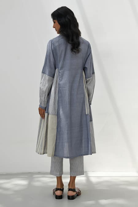 Blue Chambray Cotton Printed Striped Band Collar Monza Patchwork Dress