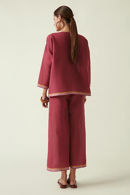 Burgundy top with contrast trims at the sleeve hems and hem.