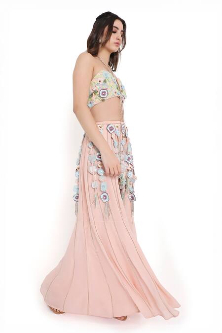 Pink Georgette Embroidered 3d Flower Halter Neck Blouse With Sharara