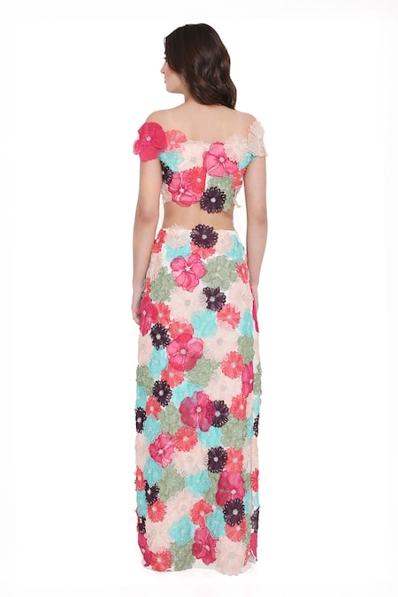 Off white blouse featuring multi color 3D flower embroidery. Paired with a fitted skirt adorned with the same intricate embroidery.