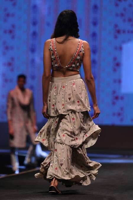 Grey choli with geometric motif embroidery. Paired with layered sharara.