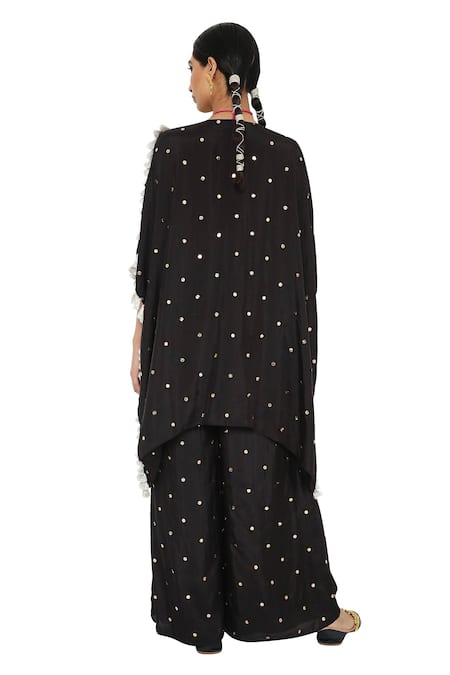 Black kaftan in Abutai silk base fabric with dot mukaish work. Paired with palazzo.