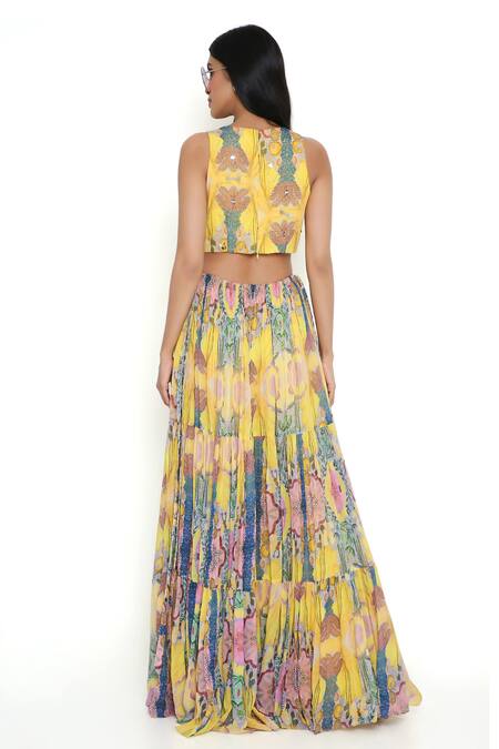 Yellow Georgette Print Floral V Neck Abstract Dress