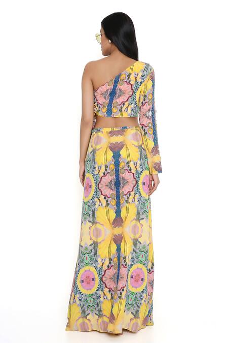 Yellow skirt set featuring an asymmetric neck top with one shoulder sleeves and floral print. Paired with a skirt that includes an attached can-can and drape detailing.