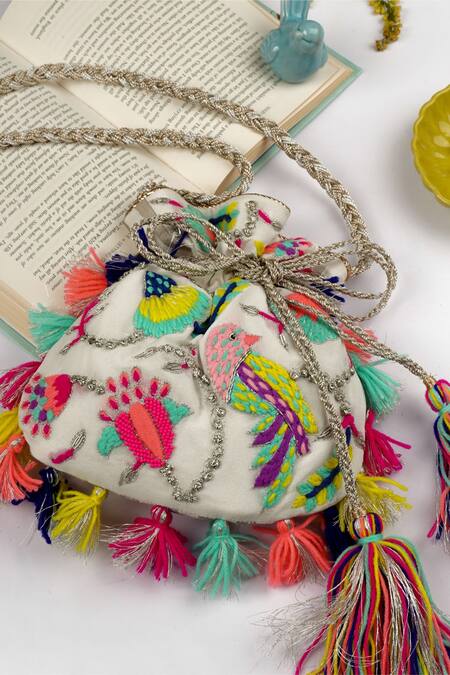 White potli featuring multicolor bird and floral embroidered motifs with tassels on the edge