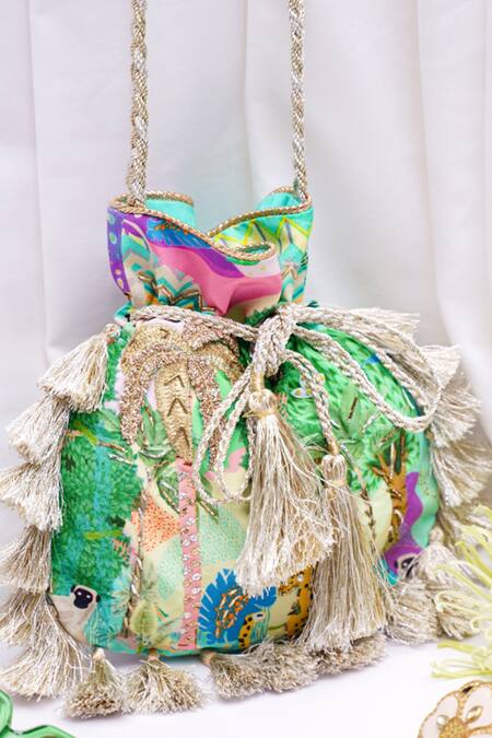 Grey potli bag featuring kuno print, embroidery, and fringe detail on the border
