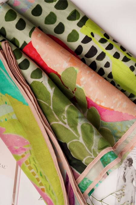 Contrast trim at the border, Handcrafted dyeing process, Unique print placement variations
