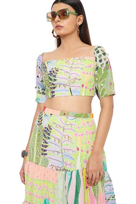 Green Georgette Sequin, Tropical Square Neck Agnes Printed Top And Skirt Set