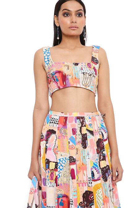 Peach top with trance print, embroidery & square neckline. Paired with asymmetric skirt.