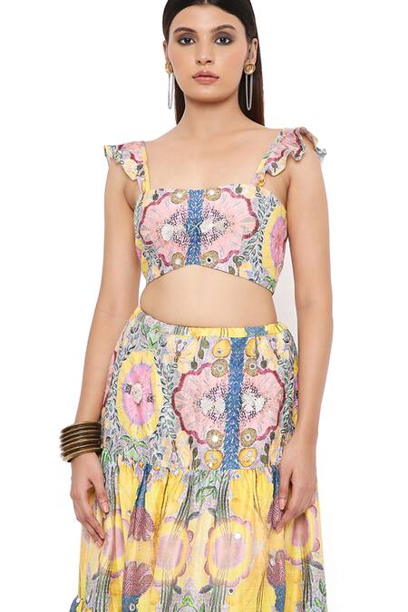Yellow bustier with enchanted print and ruffle sleeves. Comes with co-ordinating long skirt.