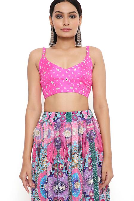 Pink jacket with floral print & mirror embroidery. Paired with bustier & frill skirt.