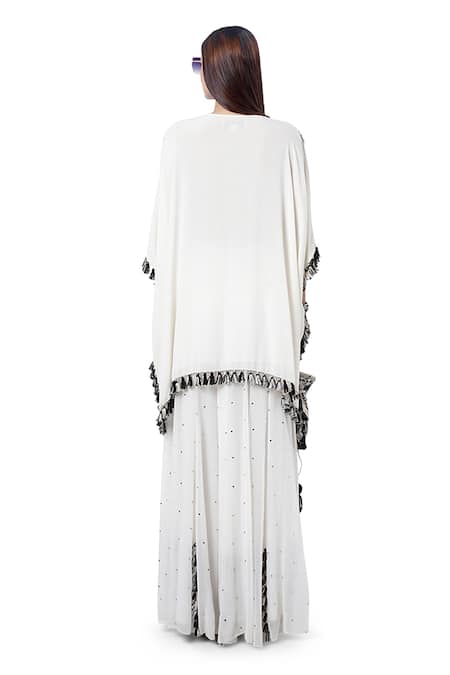 Chalk white kaftan with embroidery on the yoke and tassel details. Comes with sharara.