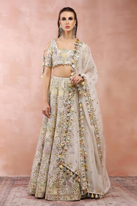 Off white lehenga featuring intricate zari, gota, thread, mirror, sequin & floral applique work. Paired with a square neck blouse with cut work sleeves and an embroidered bordered dupatta.