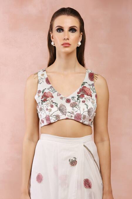 Off white organza pre-draped saree featuring all over floral applique embroidery and bead work border. Paired with a velvet V neck blouse adorned with gulbagh print, bead, zari, and resham work highlights.