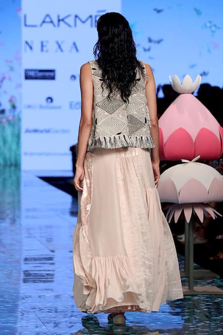 Open front jacket with fringe detail, Lehenga with ruffle hem, Note:Hairband worn by the model is not for sale