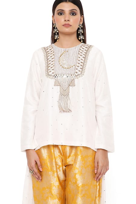 Off-white high low kurta with moon, mirror, geometric embroidery. Paired with mustard brocade pant.