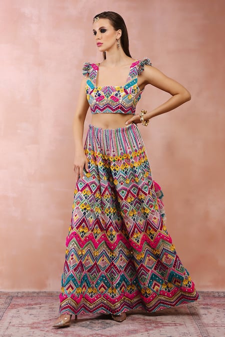 Multicolor choli featuring a square neckline, sleeveless design, and tassel detailing on the shoulder. Paired with a panelled sharara showcasing vibrant chevron embroidery with mirror and thread work.