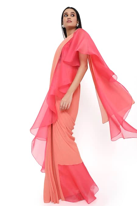 Coral and peach pre-draped saree featuring ruffle detailing. Paired with a floral applique work blouse with spaghetti straps.