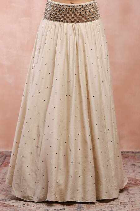 Cream Chikankari Embroidered Mukaish Round Neck Blouse Lehenga Set