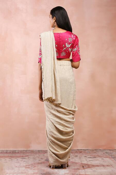 Silver organza crushed tissue pre-draped saree with attached pleated draped pallu. Paired with a hot pink satin blouse featuring vintage pattern resham, mirror & zari embroidery, U neck, and half sleeves.