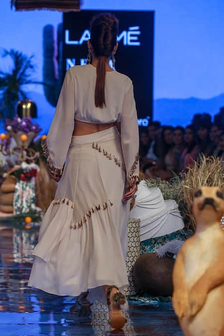 Chalk white georgette balloon top with embroidered yoke. Paired with organza asymmetric panelled skirt with tassel embellishments.